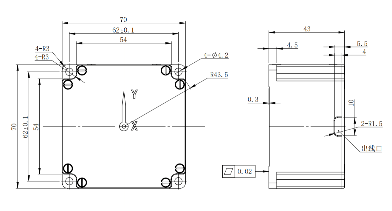Габаритные размеры: 70 мм * 70 мм * 43 мм, размер для установки: четыре отверстия 62 мм * 62 мм, крепежные винты: 4 винта M3, форма и размеры для установки показаны на рисунке 2.